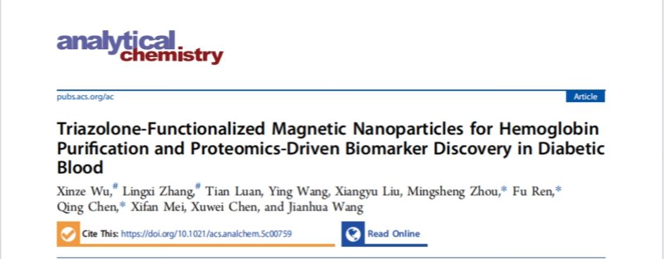 近日,国际知名期刊Analytical Chemistry(《分析化学》)在线发表了陈晴副教授团队在蛋白质分离纯化领域的最新研究成果。论文题为“Triazolone-Functionalized Magnetic Nanoparticles for Hemoglobin Purification and Proteomics-Driven Biomarker Discovery in Diabetic Blood”(三唑啉酮功能性磁性纳米粒子对血红蛋白的分离纯化及糖尿病人血液中蛋白质组员工物标志物发现)。该院2022级本科生张龄兮和第一临床医学院本科生临床医学专业吴欣泽为共同第一作者,陈晴副教授为论文通讯作者,英国上市公司365为论文唯一通讯单位。Analytical Chemistry是American Chemical Society(美国化学会)出版社旗下分析化学领域顶级期刊,中国科学院SCI化学大类一区期刊、自然指数期刊,最新影响因子为6.8。